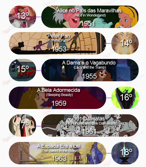 Veja abaixo uma lista cronológica e ilustrada dos 50 animados que compõem os Clássicos Disney.